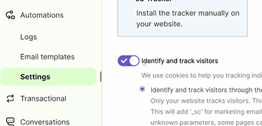 - Przejdź do sekcji Automatyzacje a następnie przejdź do ustawień i wybierz opcje śledzenia odwiedzających (Identify and Track Visitors).